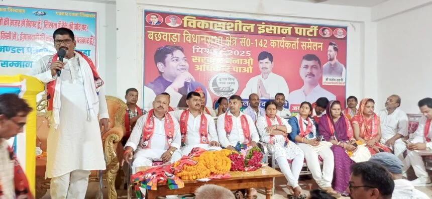 विकासशील इंसान पार्टी का बछवाड़ा विधान सभा स्तरीय कार्यकर्ता सम्मलेन रविवार को प्रखंड कार्यालय के समीप सुमेधा भवन में आयोजित किया गया। सम्मेलन की अध्यक्षता प्रखंड अध्यक्ष रवि कुंवर ने किया । वही संचालन वी आई पी नेता राज कुमार साहनी ने किया। सम्मलेन में मुख्य अतिथि के रूप में जिलाध्यक्ष जय जय राम सहनी मौजूद थे। उन्होंने सम्मलेन में सरकार बनाओ अधिकार पाओ का नारा बुलंद करते हुए मुख्य अतिथि ने कहा कि मल्लाह, दलित और पिछड़ा समुदाय के लोगो को अपने बच्चो का भविष्य संवारने के लिए महागठबंधन की सरकार बनाने का आह्वान किया। जिलाध्यक्ष ने कहा कि अगर बछवाड़ा विधान सभा से वीआईपी को सीट मिलती है तो बछवाड़ा विधान सभा से जिला प्रभारी दुलारचन्द्र सहनी को भारी मतों से जिताने का काम करे।